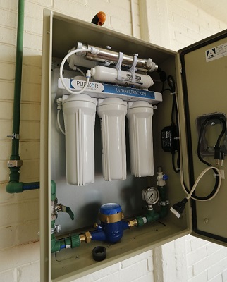 Los equipos de purificación de agua de siete etapas consisten en un gabinete de alta calidad recubierto con pintura epóxica poliéster, con una válvula reguladora de presión, dos manómetros, un caudalímetro, un filtro de malla de acero inoxidable de 40 micras, un filtro de polipropileno termofusionado de cinco micras, dos filtros de carbón activado, dos filtros con membrana de ultrafiltración y una lámpara ultravioleta.