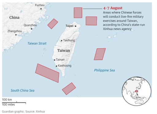 El gobierno de China reaccionó con indignación a la visita de Pelosi a Taiwán. Tras su llegada, el ejército chino anunció una serie de ejercicios aéreos y marítimos conjuntos cerca de Taiwán, realizados a partir de la noche del martes y que incluían pruebas de lanzamiento de misiles convencionales en el mar situado al este de Taiwán.