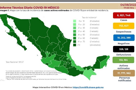 En tanto, 328 mil 128 personas, han fallecido como consecuencia de la enfermedad ocasionada por el coronavirus SARS CoV2 y de ellas, 122 fueron reportadas en las últimas horas.