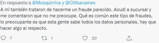 «A mi hermano le pasó casi lo mismo y fue hace como 8 meses. Te llaman del número REAL de citibanamex e intentan robar. Porqué no han arreglado eso? Son los mismos empleados robando? ¿El banco coludido?»; «Pasé por lo mismo hace 2 meses. Llamé a @Citibanamex para pedir ayuda y tardaron DOS HORAS para ayudarme a bloquear la cuenta. DOS HORAS. Por su culpa me dejaron $12 en mi cuenta. Y ahora nadie en @Citibanamex quiere hacerse responsable…», fueron algunas denuncias.