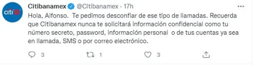 «Te pedimos desconfiar de ese tipo de llamadas. Recuerda que Citibanamex nunca te solicitará información confidencial como tu número secreto, password, información personal o de tus cuentas ya sea en llamada, SMS o por correo electrónico», mencionaron.