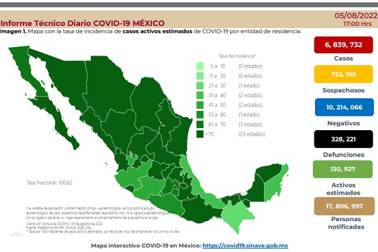Los casos activos, es decir, con síntomas en los últimos 14 días, se reportan en 124 mil 932, con una tasa de incidencia de 96 por cada cien mil habitantes. La Ciudad de México, Baja California Sur y San Luis Potosí, son las entidades con el mayor número de contagios con capacidad de transmisión.