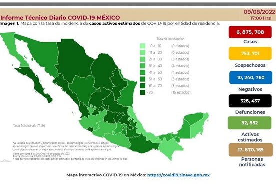En lo que respecta a los casos activos, aquellos positivos que iniciaron síntomas en los últimos 14 días, se tienen registrados 88 mil 126 con una tasa de incidencia de 67.7 por 100 mil habitantes (Del 27 de julio al 9 de agosto del 2022).