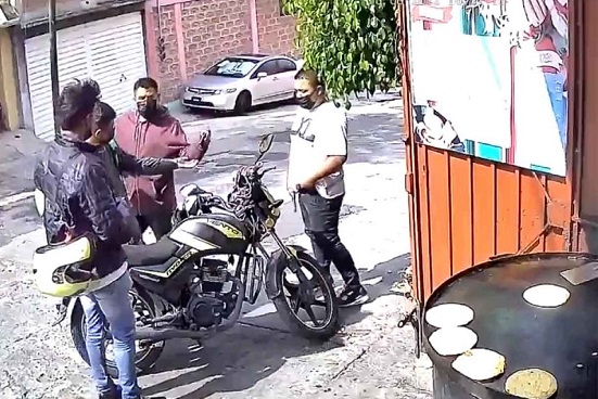 En las imágenes se observa a tres hombres que se acercan a la víctima quien está acompañada por otro motociclista enfrente de un puesto de garnachas.
