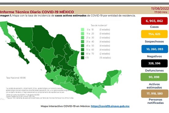 En el mismo reporte se detalla que hasta este día los casos activos, aquellos positivos que iniciaron síntomas en los últimos 14 días, se contabilizan en 86 mil 62, con una tasa de incidencia de 66.1 por 100 mil habitantes (Del 29 de julio al 11 de agosto del 2022).