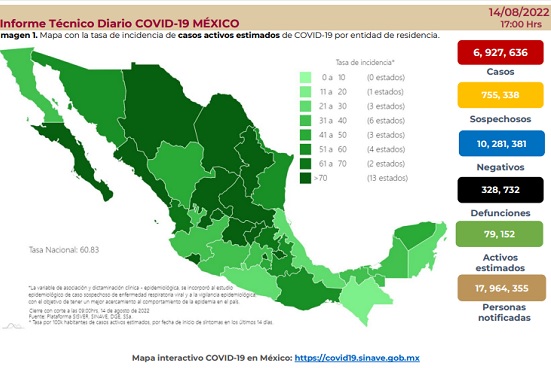 Respecto a la estadística de casos activos, las autoridades reportaron 79 mil 152, los cuales se refiere a personas que se infectaron del virus respiratorio en los últimos 14 días y todavía lo pueden contagiar.