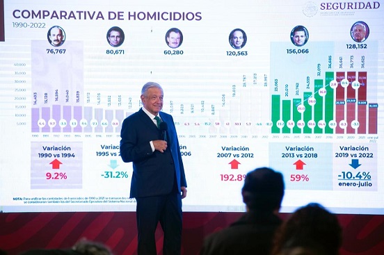 Al insistir en que la estrategia de seguridad de su gobierno requiere tiempo para su aplicación, presumió la reducción de 10.4 por ciento en la incidencia de homicidios dolosos de enero a julio de este año, en comparación con el máximo histórico registrado en 2018.