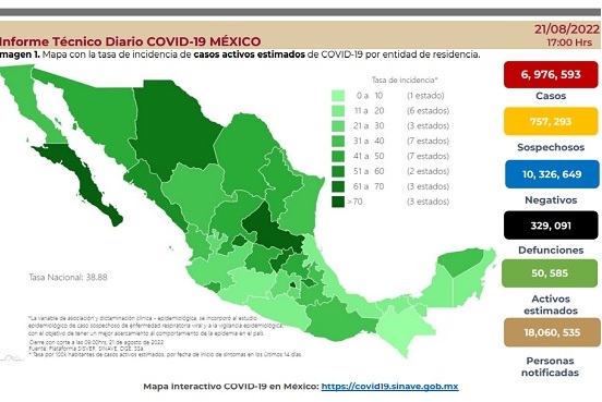 La cifra oficial de muertes por Covid-19 en México ascendió este domingo a 329,091 decesos, mientras que el acumulado de contagios de esta enfermedad aumentó a 6 millones 976,593 casos.