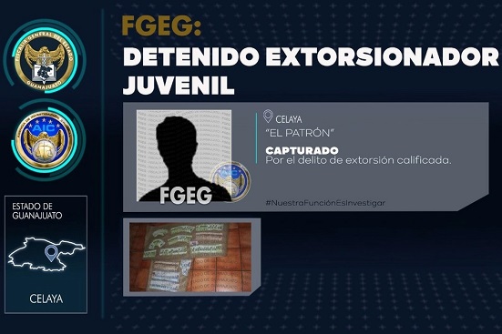 En un comunicado, la FGE informó este martes que la Unidad Especializada en Combate al Secuestro y Extorsión capturó a un adolescente que extorsionaba a comerciantes de la Central de Abastos de la ciudad de Celaya.