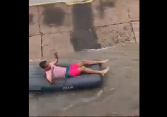 En un video difundido en redes sociales, se aprecia al muchacho disfrutando de la inundación en un canal, a bordo de un colchón inflabe.