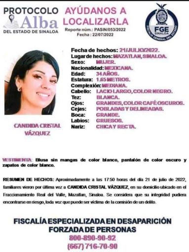 Cándida Cristal Vazquez era una locutora de Mazatlán, a quien apodaban ‘Chulis’. En su ficha de búsqueda se describe como una mujer de 34 años de edad, con una estatura de 1.65 metros, complexión mediana, cabello largo, color café, ojos grandes del mismo color, quien en el trienio pasado colaboró en el Policía Municipal de Mazatlán, en el área de comunicación.