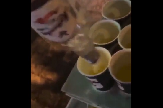 “Les voy a echar pinche Matusalem… Mañana van a estar a tope todos, pinche carrera va a ser la mejor del mundo”, dice este individuo mientras vacía ron a los vasos de bebidas energéticas para hidratar a los competidores.