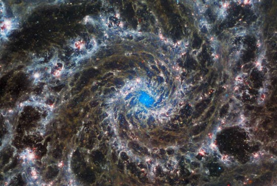 Gracias a la visión infraroja del Webb se revelan delicados filamentos de gas y polvo en los brazos espirales de M74, mismos que se enrollan hacia afuera desde el centro de la imagen.