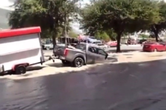 En dicho sitio, la tubería de 24 pulgadas se rompió y derivó que la humedad provocara reblandecimiento del suelo y un socavón, en el cual cayó una camioneta Frontier.