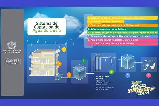 Con 11 mil litros de agua almacenada durante la última temporada de lluvias, el sistema de captación de agua pluvial de la Facultad de Geografía de la Universidad Autónoma del Estado de México (UAEMéx) fue implementado exitosamente, lo que permitirá potabilizar el vital líquido para su reuso seguro por parte de la comunidad universitaria de este espacio académico.