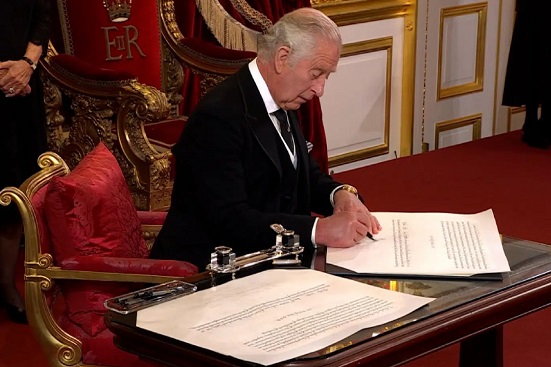 En una solemne ceremonia televisada desde el Palacio de Saint James en Londres, en presencia de su heredero Guillermo, la reina consorte Camila, la primera ministra Liz Truss y todos sus predecesores vivos, el Consejo de Ascensión firmó y anunció la proclamación del nuevo rey.