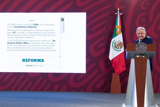 El mandatario leyó una parte de la columna Templo Mayor del diario Reforma en la que se reprueba un seminario sobre el filósofo Carlos Marx y se asegura que es una muestra de que el gobierno federal ya se “apoderó” del centro de estudios, contra el que el presidente ya se ha lanzado en diferentes ocasiones.