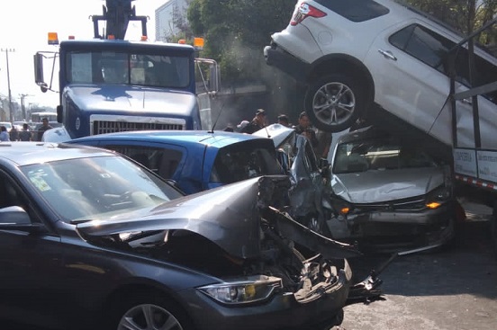 De acuerdo con los primeros reportes el tractocamión con plataforma se quedó sin frenos y embistió a los cinco vehículos sobre el kilómetro 15 de la autopista México-Toluca.