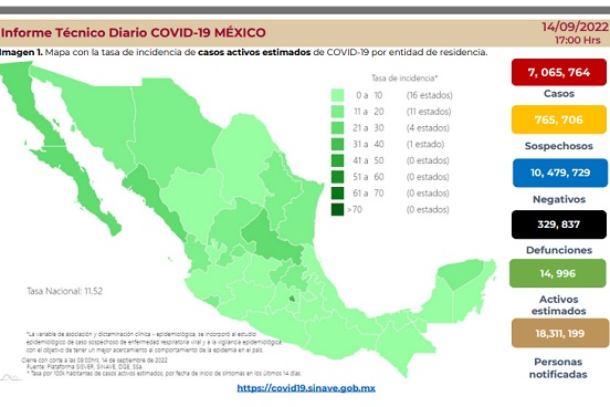 Previo a las fiestas patrias se reportan bajos niveles de Covid-19 en el país, la Secretaría de Salud reportó este miércoles 2 mil 942 nuevos casos de esta enfermedad, con los que se acumulan un total de 7 millones 65 mil 764 contagios desde que inició la pandemia en febrero de 2020.