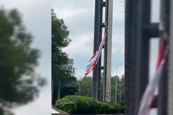 Previo al paso del Desfile Cívico Militar autoridades quitaron la manta monumental contra la militarización del país, colgada desde lo más alto de la Estela de Luz.