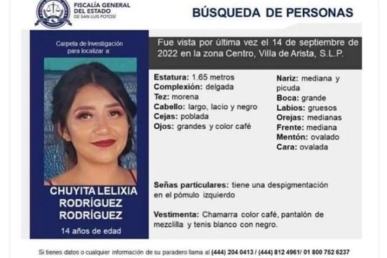 Recientemente la Fiscalía General del Estado de San Luis Potosí (FGESLP) confirmó la aparición del cuerpo sin vida de la adolescente Chuyita Lelixia Rodríguez Rodríguez, quien era originaria de la comunidad de Derramaderos, en el municipio de Villa de Arista.