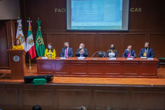 Acompañada del presidente del Colegio Mexiquense, César Camacho Quiroz; la directora de la FCPyS, Laura Benhúmea González; el coordinador general de la Red Iberoamericana de Investigadores sobre Globalización y Territorio, Sergio González López, y la directora de Estudios y Proyectos del gobierno estatal, Daniela Córdova Rojas, Zarza Delgado detalló que durante el Seminario se abordan temáticas relativas a la desigualdad socioeconómica y territorial, el cambio climático, la tecnología, la geoeconomía y geopolítica.