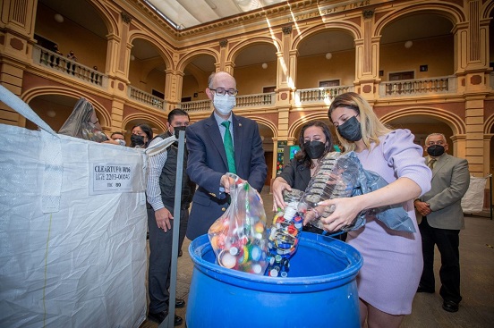 En este evento que presidió el rector Carlos Eduardo Barrera Díaz en el patio del Centenario del Edificio de Rectoría, acudieron integrantes de la Administración Central universitaria para depositar en contenedores los envases de plástico que serán intercambiados por paneles solares, los cuales serán instalados en más espacios académicos; en tanto, la entrega de taparroscas beneficiará a la Asociación Mexicana de Niños con Cáncer (AMANC).