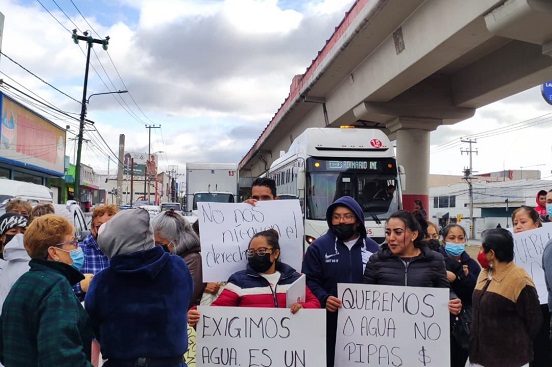 Los habitantes de la zona bloquean la avenida, una de las principales vías que conecta con la CDMX, con una fila y con carteles entre los que se pueden leer los mensajes “Exigimos agua” y “Queremos agua, no pipas”.
