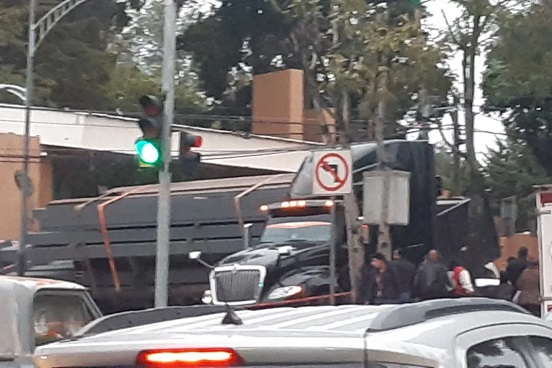 La plataforma del camión que transportaba vigas de metal se volteó y quedó cruzado en la avenida, a la altura de Limantitla, desde alrededor de las las 7:00 horas, en dirección al Caminero.