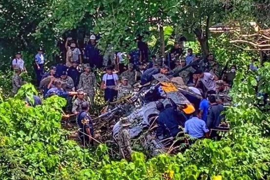 Tras registrarse el desplome el cual fue compartido en redes sociales, pobladores del lugar acudieron a auxiliar a la tripulación del helicóptero.
