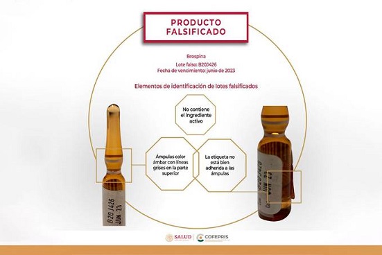 A través de un comunicado, la dependencia federal informó que la falsificación del medicamento denominado Brospina, un analgésico narcótico indicado para el control del dolor de moderado a severo, se dio en el lote B20J426 con fecha de caducidad de junio de 2023.