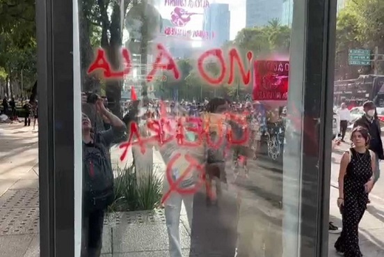 Un grupo de personas ya ha comenzado a realizar pintas sobre el mobiliario urbano a su paso por el Paseo de la Reforma.