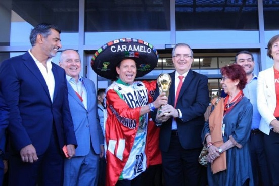 En representación del presidente Andrés Manuel López Obrador, este sábado el canciller Marcelo Ebrard recibió recibió la Copa Mundial de la FIFA 2022 en el Aeropuerto Internacional Felipe Ángeles (AIFA).
