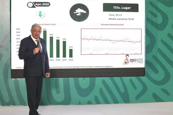 Destacó que mientras en 2018, aún en el mandato de Enrique Peña Nieto como presidente, se registraron 851 asesinatos en la entidad, en 2021 el número descendió a 526.