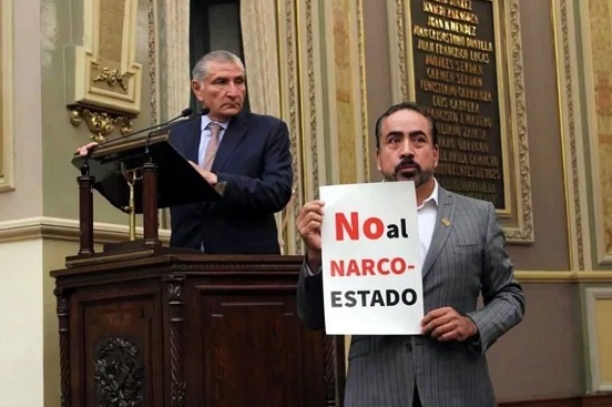 Uno de los legisladores panistas que se paró al lado del secretario traía un cartel que decía “no al narcoestado”.