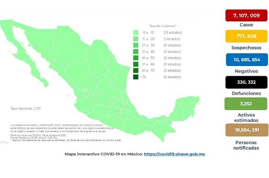 La Secretaría de Salud informó que suman 7 millones 107 mil 9 casos de covid-19 los que se han presentado en el país desde que comenzó la pandemia, estos son 3 mil 670 más que la semana pasada. Indicó que actualmente hay 3 mil 252 casos activos, es decir, aquellos que presentaron síntomas durante los últimos 14 días.