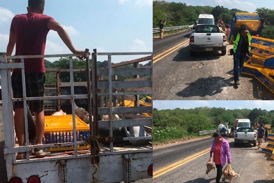 Veracruz.- La tarde del jueves se registró la volcadura de tráiler que trasportaba aproximadamente 18 toneladas de pollos, por lo que los habitantes del municipio de Paso de Ovejas no dudaron en hacer rapiña de los animales.