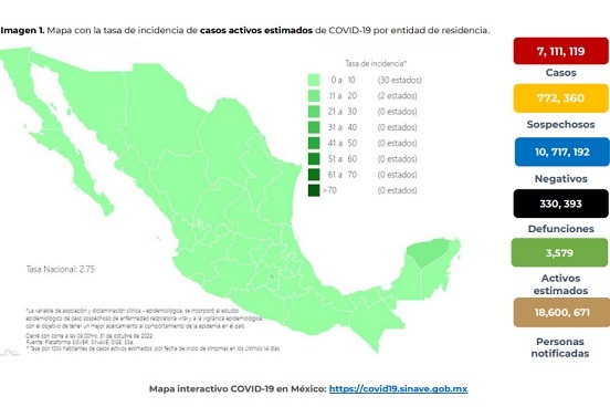 Del 26 de octubre al 01 de noviembre, la Secretaría de Salud (Ssa) reportó 4 mil 110 nuevos casos de Covid-19, con los que el país acumula un total de 7 millones 111 mil 119 contagios desde que inició la pandemia en febrero de 2020.