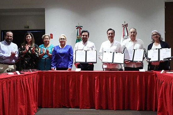 Posteriormente, el director general del Seguro Social, Zoé Robledo, y el gobernador de Veracruz de Ignacio de la Llave, Cuitláhuac García Jiménez, firmaron el convenio IMSS-Bienestar.