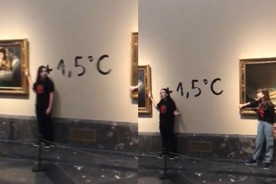 Las dos militantes no dañaron los cuadros, pero pintaron “+1,5°C” en el muro entre las dos pinturas, en referencia al objetivo de calentamiento con el que se comprometió la comunidad internacional. Las dos personas fueron detenidas, según la policía.