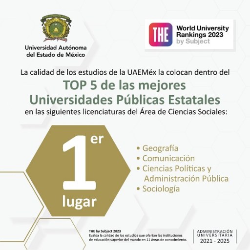 La Universidad Autónoma del Estado de México (UAEMéx) fue reconocida por el Times Higher Education (THE) by Subject en el área de Ciencias Sociales como la mejor institución entre las 35 Universidades Públicas Estatales del país por la calidad de sus programas educativos de nivel superior que ofrece.