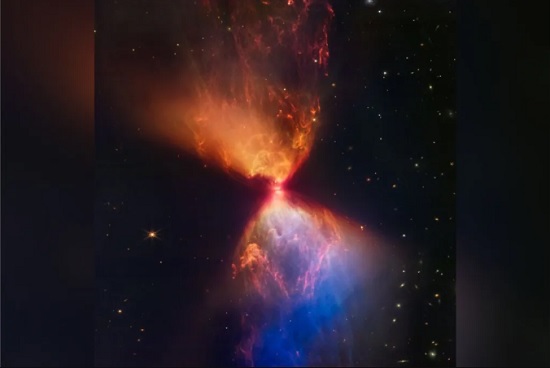 El telescopio espacial James Webb reveló el miércoles resplandecientes imágenes de una inmensa nube de polvo en forma de reloj de arena en torno a una estrella en formación.