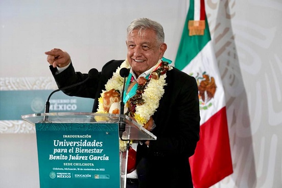 “Vamos a buscar la forma de que antes de que yo termine, aunque ustedes todavía le falte, voy a dejar un acuerdo, a ver si puedo que sea una ley para que todos los que egresen de las escuelas de medicina tengan su trabajo seguro”, expresó López Obrador ante decenas de jóvenes previo a la inauguración de un plante de la Universidad del Bienestar en esta localidad.