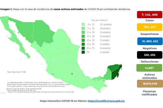 La pandemia activa también incrementó al pasar de 8 mil 634 personas con el virus a 14 mil 887. La Ciudad de México con 3 mil 604 casos, seguida de Quintana Roo con mil 377, Yucatán con mil 204, Estado de México con 940 y Chihuahua con 791; son las entidades con mayor número de personas contagiadas que presentaron síntomas en la última semana.