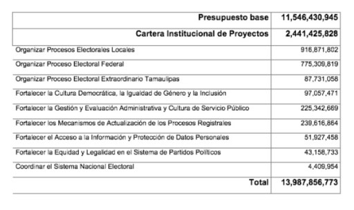 Además, resaltó que los proyectos con más recursos están encaminados a organizar procesos electorales locales, el Proceso Electoral Federal y fortalecer los mecanismos de actualización de los procesos registrales y se prescindirá de proyectos como el de la infraestructura inmobiliaria y se limitará el uso de materiales de oficina, arrendamientos, estacionamiento, servicio telefónico y energía eléctrica.