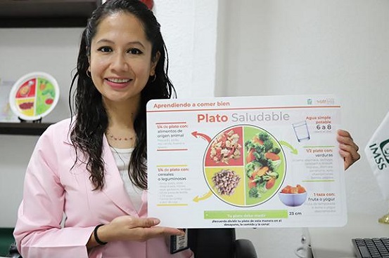 La licenciada en Nutrición, Itzel Valtierra Martínez, adscrita a la División de Promoción a la Salud, recomendó mantener una alimentación basada en el método del plato saludable que debe medir 23 cm, se divide en tres partes: en la mitad, incluir verduras crudas, asadas, al vapor o a la plancha; una cuarta parte debe ser con cereales como pan integral, arroz, tortillas o sopa de pasta; y el resto, con alimento de origen animal como pollo, res, pescado, lomo, bacalao o pavo. Se pueden incluir las verduras como guarniciones y dentro de los mismos guisados.
