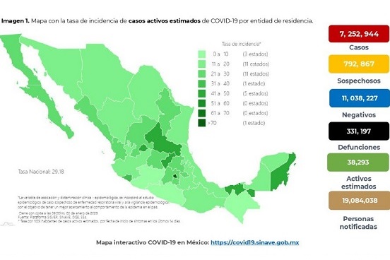 Del 27 de diciembre de 2022 al 3 de enero de 2023, la Secretaría de Salud (Ssa) reportó 30 mil 333 nuevos casos de Covid-19, con los que México acumula un total de 7 millones 252 mil 944 contagios desde que inició la pandemia en febrero de 2020.