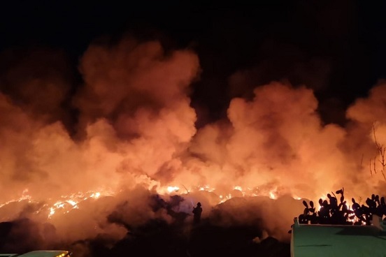 Un fuerte incendio consume el pastizal y las llantas almacenadas en un predio en el municipio de San Martín de las Pirámides, en el Estado de México.
