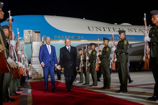 El presidente Andrés Manuel López Obrador encabezó la noche de este domingo la recepción en el Aeropuerto Internacional Felipe Ángeles (AIFA) de su homólogo de Estados Unidos, Joseph Biden, quien se encuentra en México para participar en la X Cumbre de Líderes de América del Norte el martes 10 de enero en Palacio Nacional.