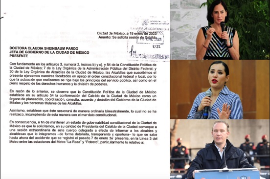Ante la falta de sesiones del Cabildo de la Ciudad en lo que va de las administraciones de las alcaldías que asumieron en el 2021, las alcaldesas en Álvaro Obregón, Lía Limón, en Cuauhtémoc, Sandra Cuevas, así como el alcalde en Benito Juárez, Santiago Taboada, solicitaron a la Jefa de Gobierno y Presidenta del mencionado Cabildo, Claudia Sheinbaum, a que convoque a una sesión extraordinaria de este cuerpo colegiado a efecto de informar a los alcaldes y alcaldesas que lo integran –de forma detallada, transparente y oportuna– lo que se sabe hasta ahora del accidente que se registró el pasado 7 de enero del presente, en la Línea 3 del metro entre las estaciones “La Raza” y “Potrero”. Lo anterior, con el fin de mantener un estado de gobernabilidad constitucional de la Ciudad de México y se cumpla con el reglamento que establece que el cabildo sesionará de manera ordinaria bimestralmente, lo cual no se ha realizado, incumpliendo de esta manera con el mandato constitucional local en su artículo 54, numeral 6, fracción III.
